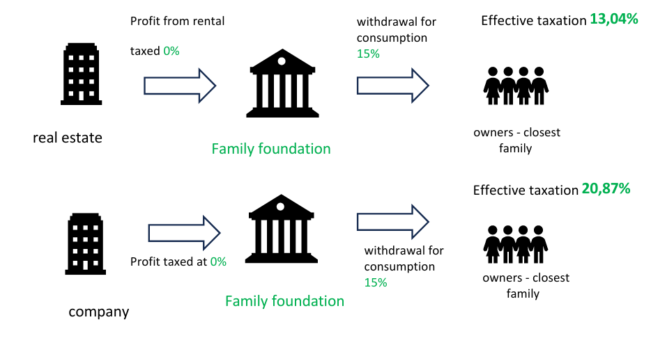 - if the beneficiary receives an asset (e.g. real estate) as a benefit from the foundation, then such a benefit will be taxed like any other benefit from the foundation with 15% CIT;